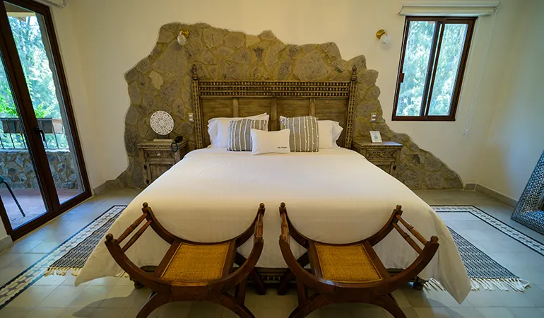 Amplia y confortable suite para 2 personas con cama King Size, baño completo, closet y amplia terraza, ideal para tener una escapada romántica en pareja, mientras disfrutas del máximo confort en instalaciones que asemejan la vida en la Toscana.
