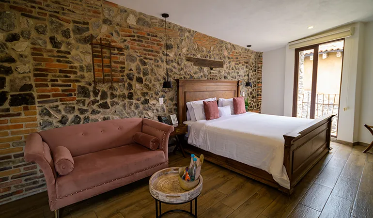 Amplia y confortable suite para 1-2 personas con cama King Size, baño muy amplio, ropero y balcón circular, ideal para tener una escapada romántica en pareja. Decoración impecable con un sillón doble para más espacio.